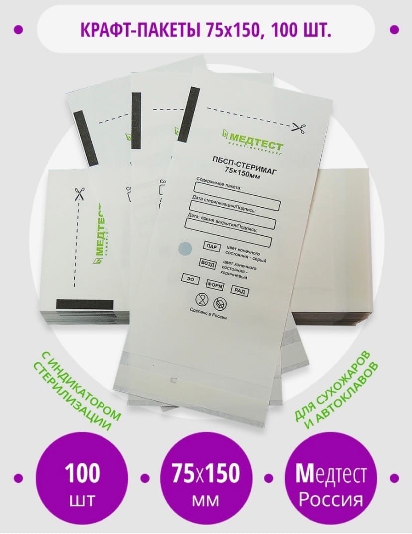 Самоклеющиеся пакеты для паровой, воздушной, этиленоксидной стерилизации изготовлены из белой влагопрочной медицинской бумаги с тремя клеевыми швами. Пакеты предназначены для стерилизации инструмента водяным паром, сухим горячим воздухом, оксидом этилена. Пакеты обеспечивают надежный "микробный барьер" при герметизации с помощью самоклеющейся ленты на клапане в одинарной упаковке – 60 дней.