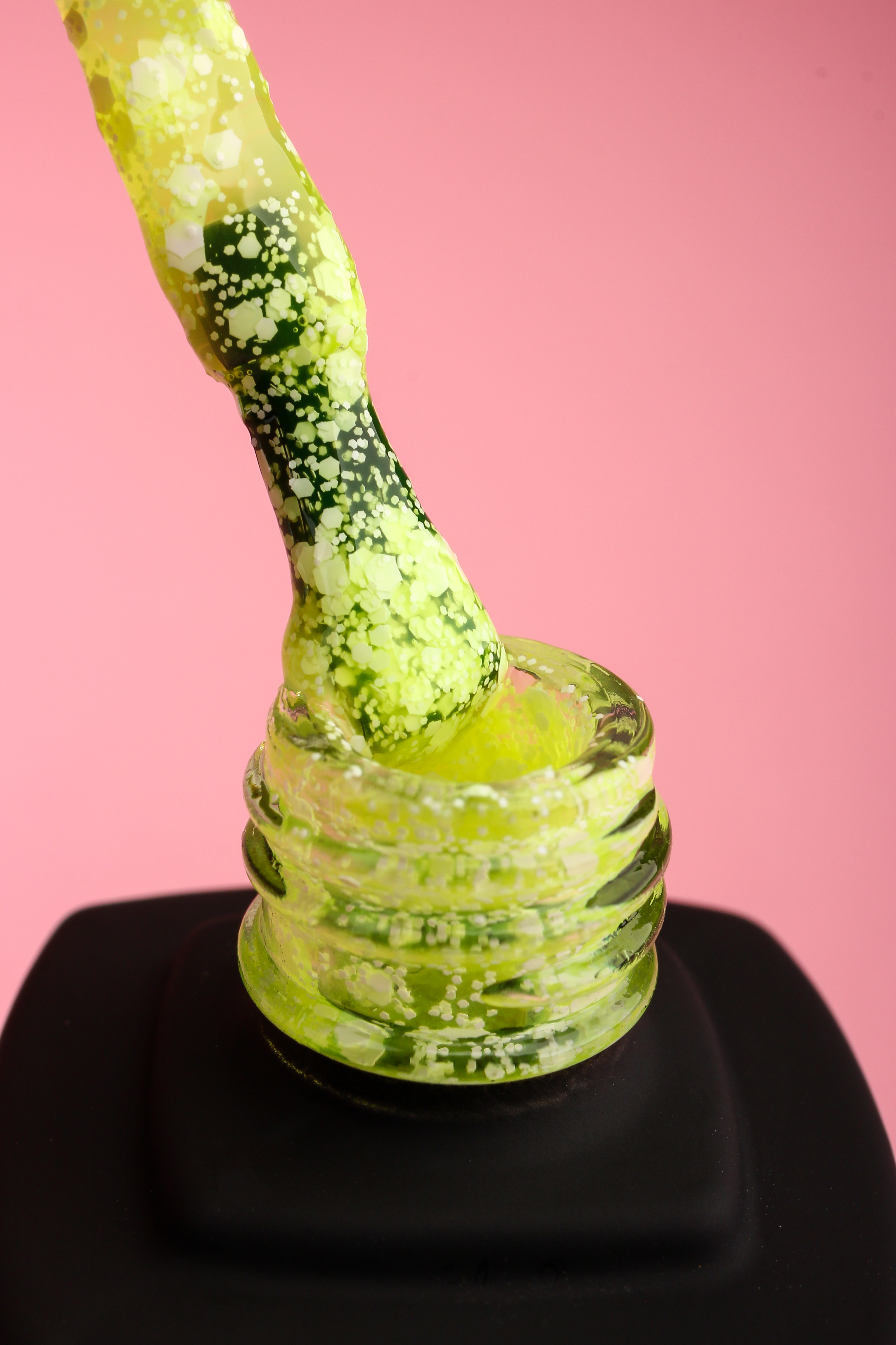 Создавай дерзкие дизайны одним движением кисти! В каждом полупрозрачном неоне из коллекции Soda утоплен матовый белый глиттер. Всего один слой — и взрывной летний нейл-образ готов!